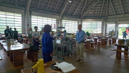 施設の方へのあいさつをしています。ボリューム満点な昼ごはんです。
