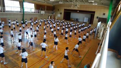 本日6限目、3年生学年練習の様子です。ビデオで研究した後、給水時間を挟み細かい動作の確認をしています。