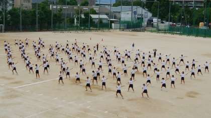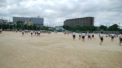 本日5限目、全員でグラウンドの石拾いの後、学年演技の練習中です。いよいよ本番さながらのグラウンド練習が始まりました。