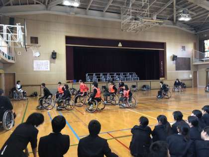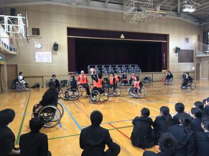 生徒達による車いすバスケットの体験です。