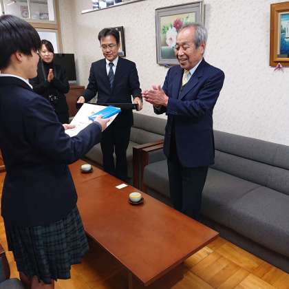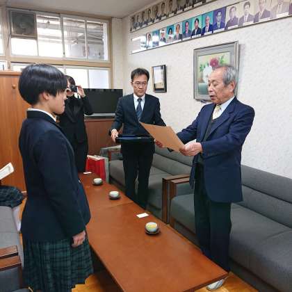 3年生の瀧川さんの作文が、西淀川区の納税貯蓄組合連合会の優秀賞を受賞しました。税務署の方々が来られ賞状の伝達をしました。