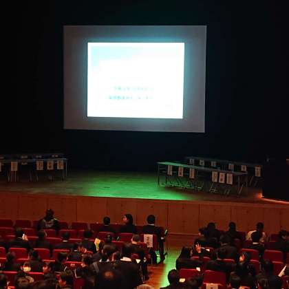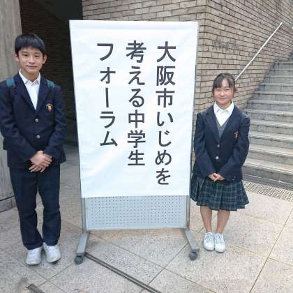阿倍野区民ホールで、大阪市内の中学校から代表8校が各校のいじめ防止の取り組みを発表しました。本校は発表校ではありませんが、各ブロックのスローガンで本校の「いじめ0より見逃し0」が採用されていたので、生徒会から2名参加しました。ここで大阪市全体のスローガンとして「いじめSTOP見逃しゼロ」が策定されました。