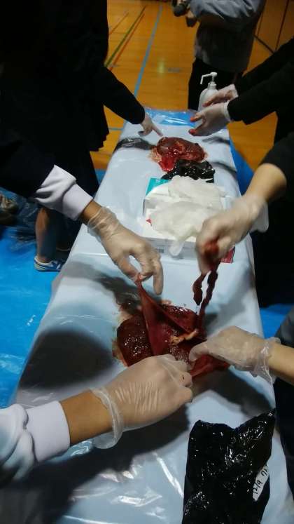 最後に、今朝出産したばかりの胎盤に触れる体験をさせていただきました。