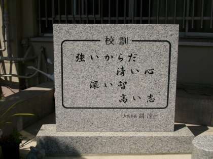 下記の写真は、正門にある校訓碑です。本校の校訓である「強いからだ・清い心・深い智・高い志」が刻字されており、生徒たちにはこの校訓を目標に教育活動を進めてまいります。