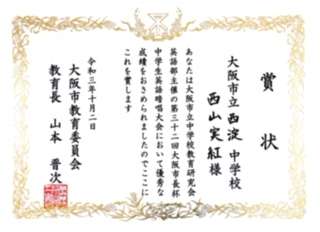 去る10月2日(土)に本校の3年3組 西山実紅さんが出場した、大阪市長杯中学生英語暗唱大会(咲くやこの花中で実施)で見事に「教育長賞」を受賞しました。流暢なスピーチができないと、取れる賞ではありません。おめでとうございます。