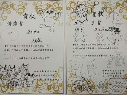 が審査員となり、8班の中から、最優秀賞・優勝賞・ユニーク賞・チームワーク賞の表彰を行いました。賞状も手作りです。ひょとしたら、この中からCMクリエーターが生まれるかもしれません。