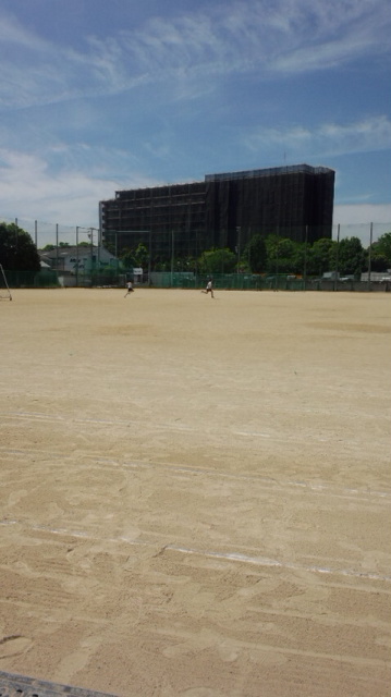 2年生の体育の授業風景です。大変見えにくいですが、男子は100メートル走、女子はバレーボールを行っています。暑い中、生徒たちは頑張っています。