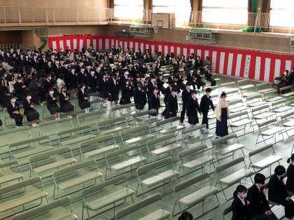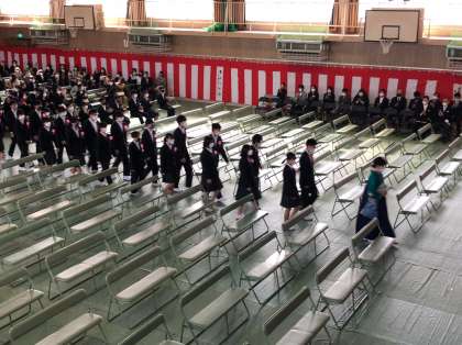 胸には1年生と2年生がつくったメッセージ付きの花をつけています。
