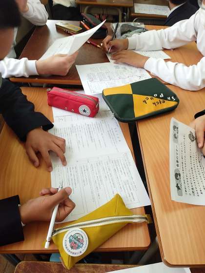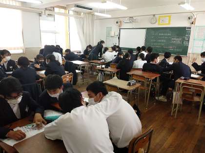 3年生6限目、各クラスでの班会議の様子です。5限係会議の結果を各班で報告しています。このような取り組みによって、修学旅行に向けての“ワクワク度“が上がってきています。