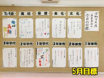 今朝の全校集会において、各委員会代表が目標と、その設定理由を説明していました。