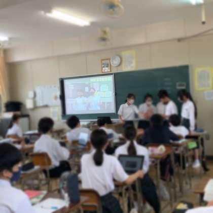 1年技術では、以前紹介した「ネットリテラシー」についての授業です。各班が気をつけなければいけないことなどを工夫を凝らして紹介していました。