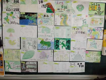 3年生各クラスの学級旗デザイン選定の様子です。クラスカラー・クラス番号・学級名をデザインに入れ込むことが必須となっています。どれも個性豊かです。この中から投票で決定します。写真は、1・2組です。