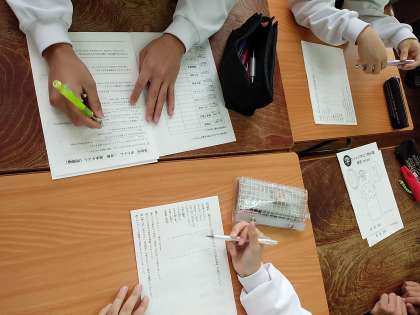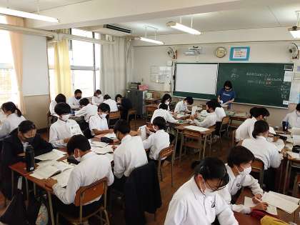 本日6限目、第1回実力テストの反省のあと、各教科の期末テスト対策プリントを使って互いに教え合う(”学ちゃん”)取り組みの様子です。テストに出る問題がこの中に含まれているため、みんな真剣です。点数アップできますように!!