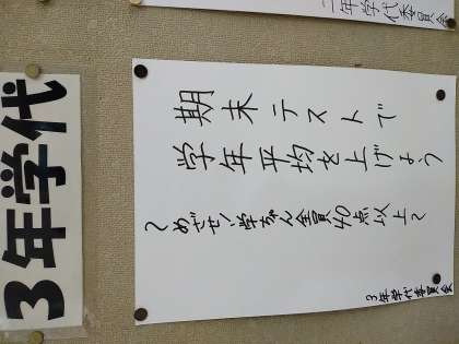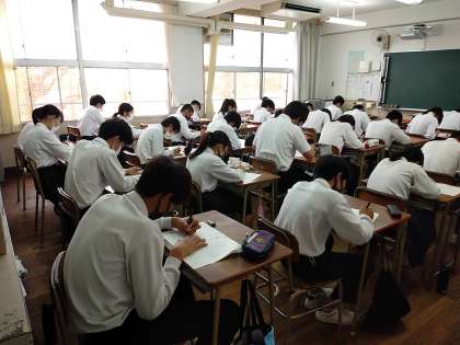 3年生1限目、まなちゃん(学び合い)の様子です。今日は先日からの取り組みの仕上げです。今月の学年目標である”期末テストの学年平均点アップ”のため、この小テストで全員40点以上を目指しています。がんばれ!3年生!