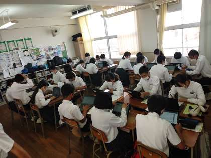 本日6限目、3年生進路学習の様子です。過去5年間の先輩たちの進路先について、班ごとでパンフレットや各校のHPを調べてまとめています。