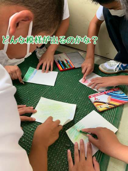 廊下を歩いていると、2年生が廊下で何か作業をしています…気になって近寄ってみると、足拭きマットの上に画用紙を置いて色鉛筆でゴシゴシと塗っています。