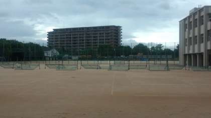 風が強くなってまいりました。隣の尼崎市では暴風警報が発表されています。本校では、写真のように、暴風に備えて防球ネットを倒しています。