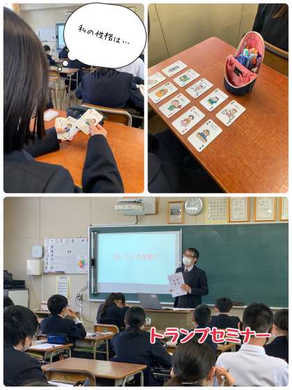 本日は、ヒューマンキャンパスより講師をお招きして、1年生がトランプセミナーの講座を受けています。将来の職業選択に向けて、自分の適性を知ることができるものです。