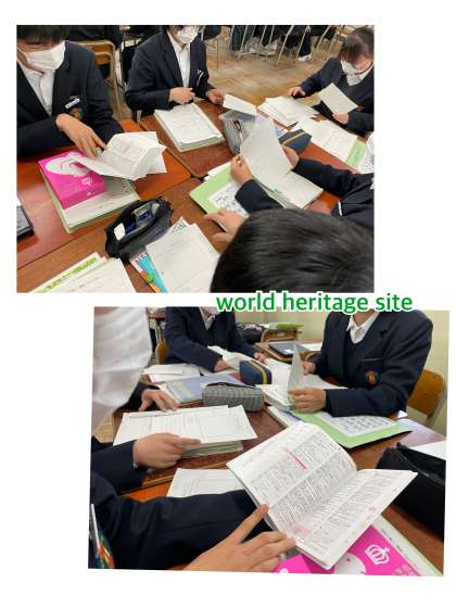 2年生の英語の授業では受動態を学んでいます。今回は「世界遺産」について各グループが発表しました。まずは1人ずつの生徒がそれぞれ調べた「世界遺産」の中から、グループで発表するものを1つ選び、発表原稿を英作しました。eye
