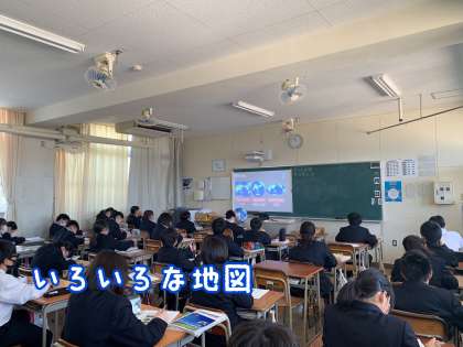 1年地理では、さまざまな地図の違いや特徴について映像を用いて学んでいました。