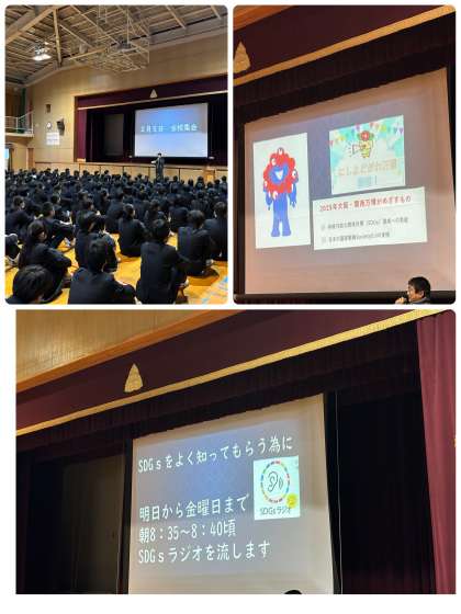 今日の全校集会では、2025年に開催される関西万博に向けての西淀川区の取組を紹介しました。明日より4日間「SDGsラジオ」を聴いて、生徒一人ひとりがSDGsについて考えるきっかけにしたいと思います。