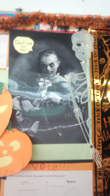 本日、ALT(外国語指導助手)のJojo先生が、「ハロウィン」の仮装で3年生の授業を行いました。