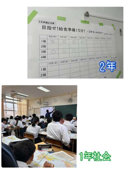 2年生の廊下にはこのような掲示物がありました。これは全校生徒で取り組んでいる活動で、給食の準備がなかなかスムーズに進まないことから、生徒評議会で取り組むことが決められたとのことです。