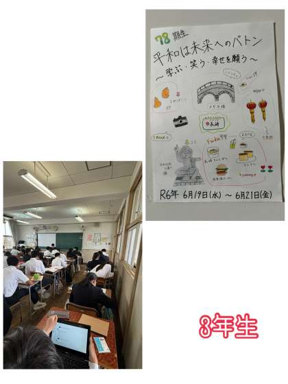 3年生は、テスト勉強をしていました。問題集に取り組む生徒や、Navima(デジタルドリル)に取り組む生徒など、さまざまでした。3年生の廊下には、修学旅行に向けた掲示物がたくさんあります。テストが終われば、体育大会、修学旅行と3年生の活躍の場面が目白押しです。
