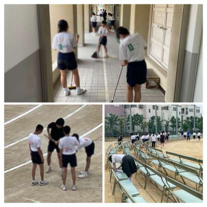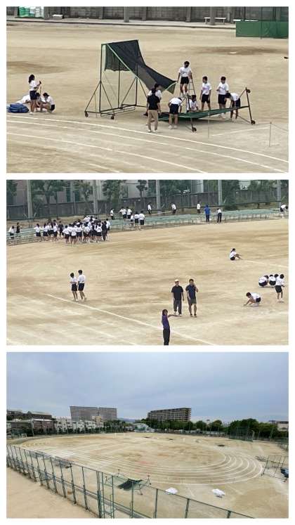 準備の係にあたっている生徒たちがきびきびと動いて、会場が整いました。日よけのテントは明日の朝に組み立てます。