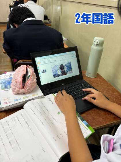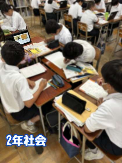 また、2年社会の授業では、班ごとにスライドを見て問題を解いていました。それぞれ熱心に取り組んでいました。