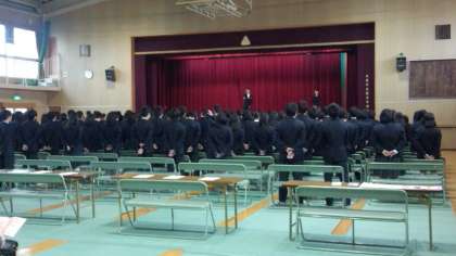 本日、3年生合唱コンクールを実施しました。まず最初に、全員で課題曲である「名づけられた葉」を合唱しました。