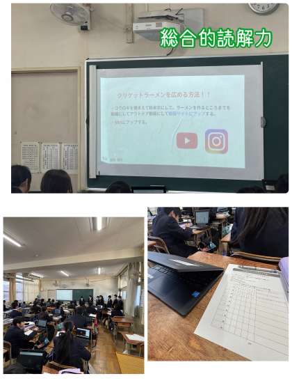 昨日のことですが、1年生は「総合的読解力」を身に着けるために、教育委員会が作成した教材をもとに授業を行っていました。今日は、プレゼンテーションの日です。みんな真剣に発表を聞いていました。