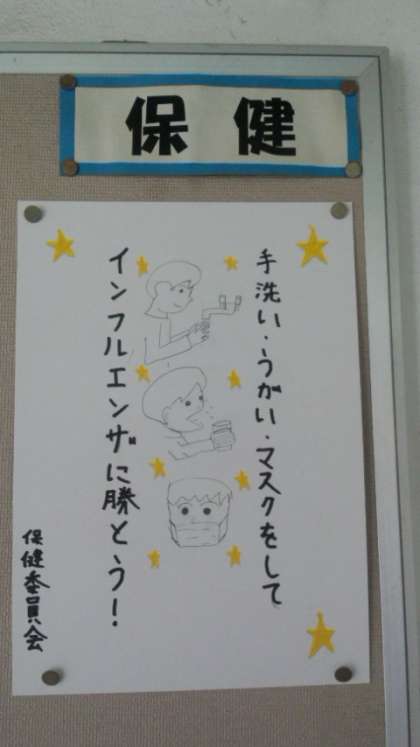 写真は、保健委員会の生徒が作ってくれた月間目標です。今週になり、大阪市の幼稚園や小中学校でインフルエンザによる学級休業等が増えて来ました。月間目標の通り、インフルエンザの日常生活における予防法として、下記の3点をお願いします。
