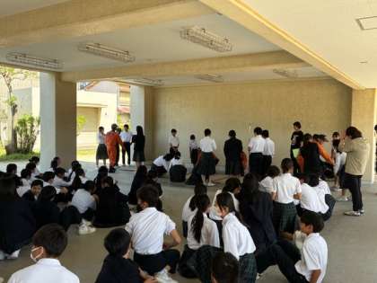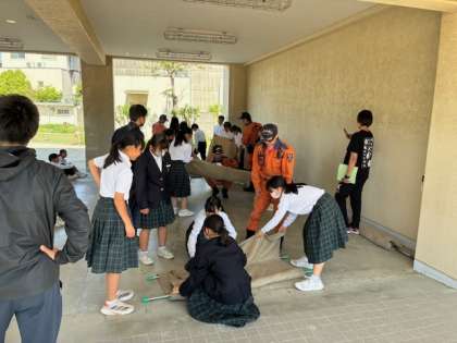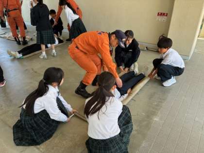 避難訓練の後の消防体験の様子です。学年ごとに、さまざまな体験を行いました。