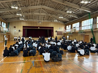修学旅行当日の朝を迎えました。体育館の様子です。