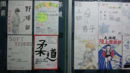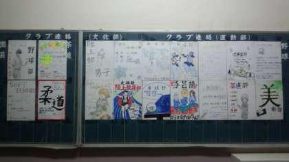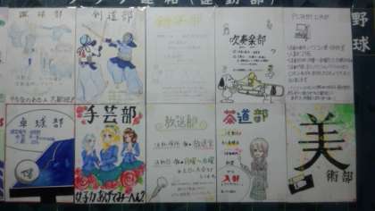 明日の6時間目に部活動編成を行います。希望の部活動に入部手続きをしてください。写真は各部活動の紹介ポスターです。