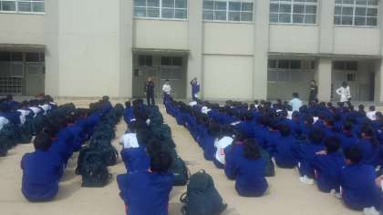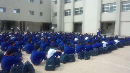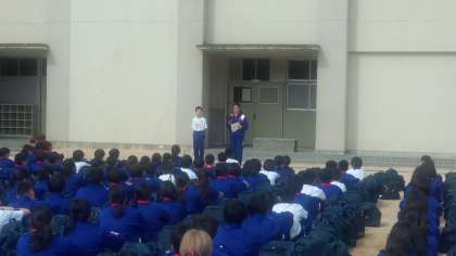 出発式です。教頭先生や生徒代表のお話をしっかりと聞けています。