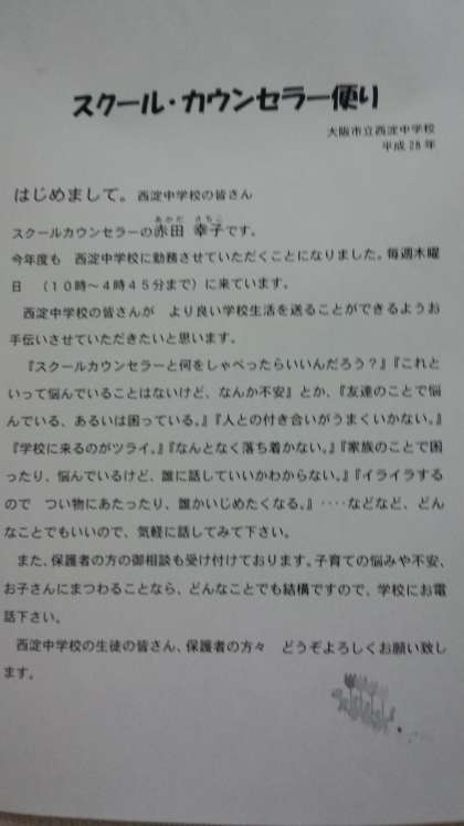 スクールカウンセラーは、大阪市立の全中学校に配置され、本校では、木曜日(午前10時から16時45分)に実施しています。学校生活や家庭生活などでの様々な悩みや相談事があれば、遠慮せずに相談してください。また、生徒だけではなく、保護者の方も相談の対象となっています。