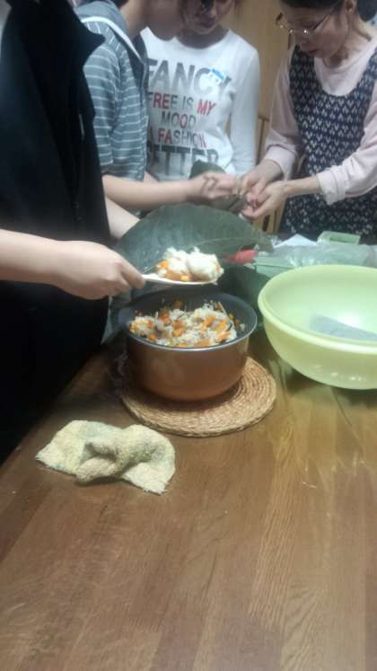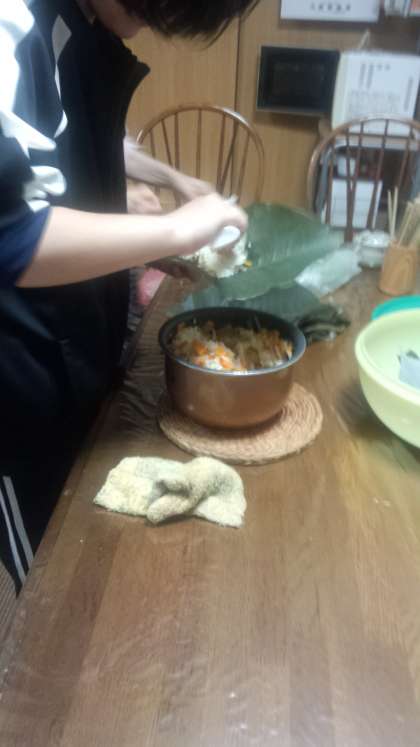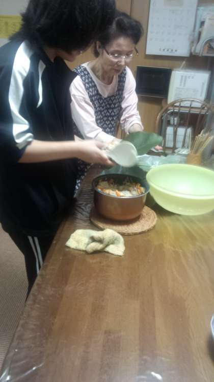 同じ民泊先です。地元の郷土料理「朴葉寿司」をつくっています。