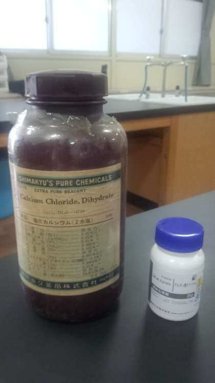 今日の科学部の実験は「人工イクラを作ってみよう」です。アルギン酸ナトリウム・塩化カルシウム・食紅を用意します。