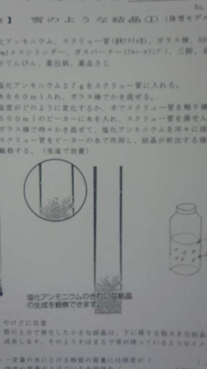 今日の実験は、雪のような結晶づくり(降雪モデルの観察)です。塩化アンモニウムを水に溶かして冷却すると雪のような結晶が析出してきます。