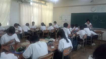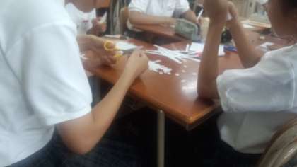 2年生は先日行った課題テストの反省、1年生は文化発表会の取組(モザイクアート)を行いました。写真は、1年生のモザイクアート作りの様子です。