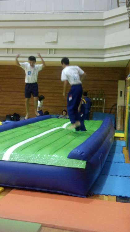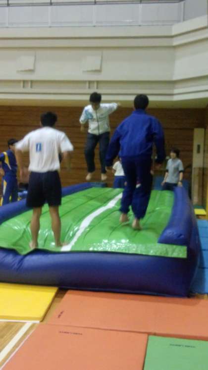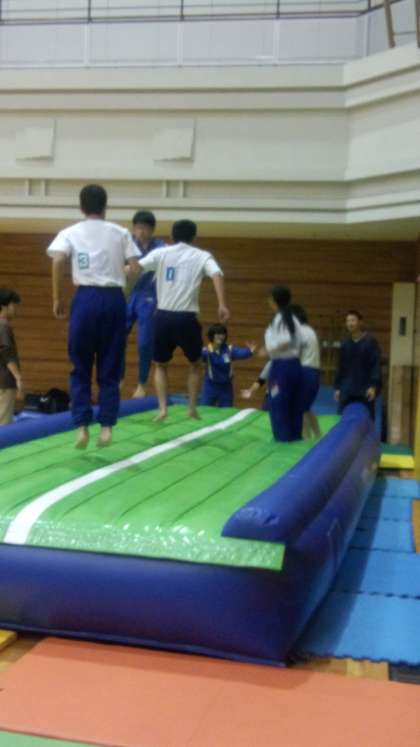 本日、サポートルームの生徒4名が、「ふれあいデイキャンプ(会場:アミティ舞洲)」に参加しています。写真は、「エアートランポリン」をしている様子です。