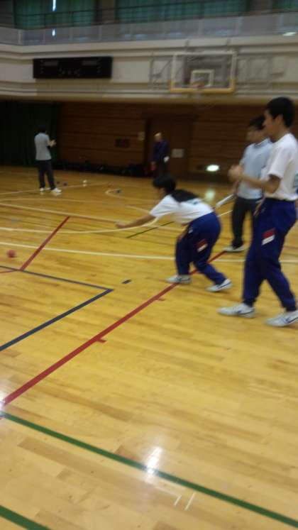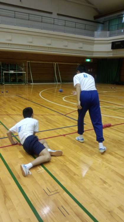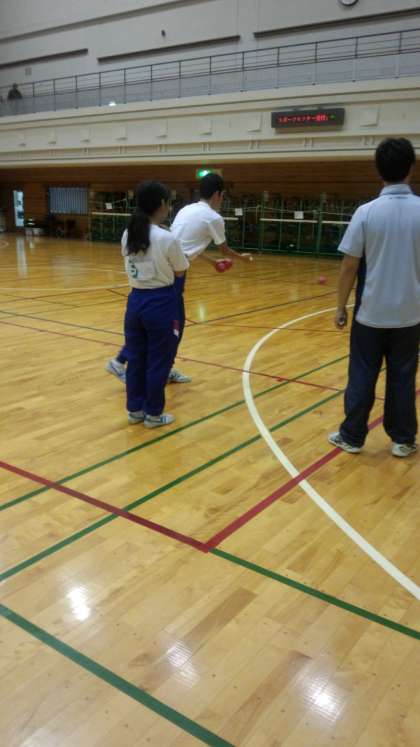 「ボッチャ(目標球に向けてボールを投げたり転がしたりして、いかに近づけるかを競うスポーツのこと)」をしている様子です。