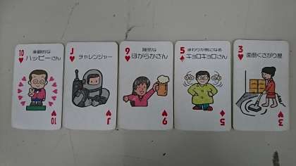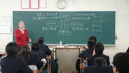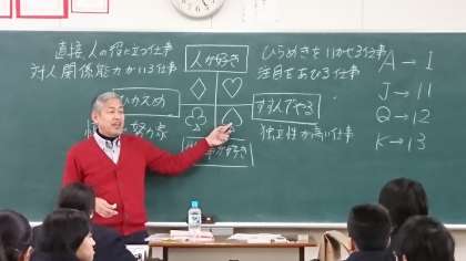 本日、1年生はヒューマンキャンパス高等学校の川島先生を講師としてお招きし、キャリア教育の一環として、SPトランプセミナーを行っています。SPトランプとは、写真の通り、よく見られる性格を描いた52種類の特徴(SP=サブパーソナリティー)を描いたトランプです。そして、トランプセミナーは、52種類のトランプから10枚のトランプを選んだ後、自分の特性から将来どんな職業に適しているかを考える授業です。1時間目の1年5組の生徒たちは、とても楽しそうに積極的に授業に取り組んでいました。
