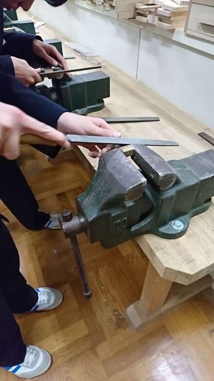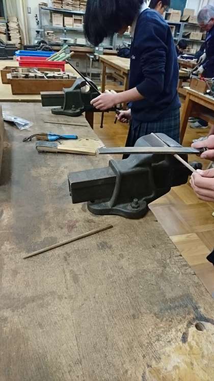 1年3組の技術の授業です。お箸と箸置きを制作しています。地道な作業ですが一生懸命に取り組んでいました。