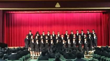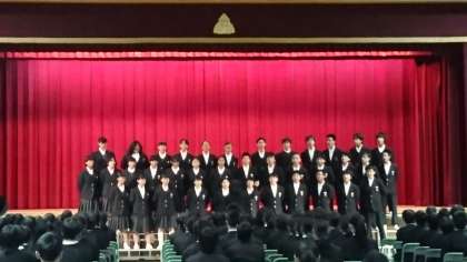 本日、1年生は合唱コンクールを行いました。最初は5組の発表です。課題曲「翼をください」と自由曲は「With you smile」です。