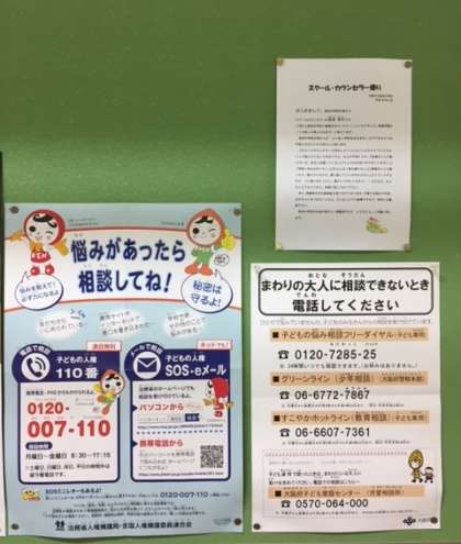 スクールカウンセラーは、大阪市立の全中学校に配置され、本校では、月曜日(午前10時から16時45分)に実施しています。学校生活や家庭生活などでの様々な悩みや相談事があれば、遠慮せずに相談してください。また、生徒だけではなく、保護者の方も相談の対象となっています。