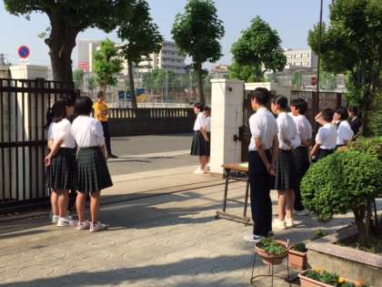 正門付近であいさつ運動を行っています。登校してくる生徒たちに「おはようございます」と声を掛けています。いつもありがとうございます。
