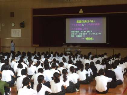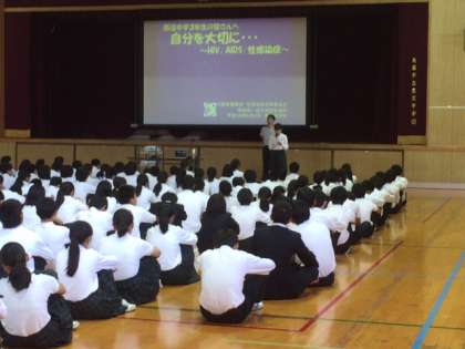大阪府医師会 学校医部会 性感染症対策委員会 の 福田弥一郎先生をお招きし、AIDSや性感染症についての講義を体育館で聞きました。